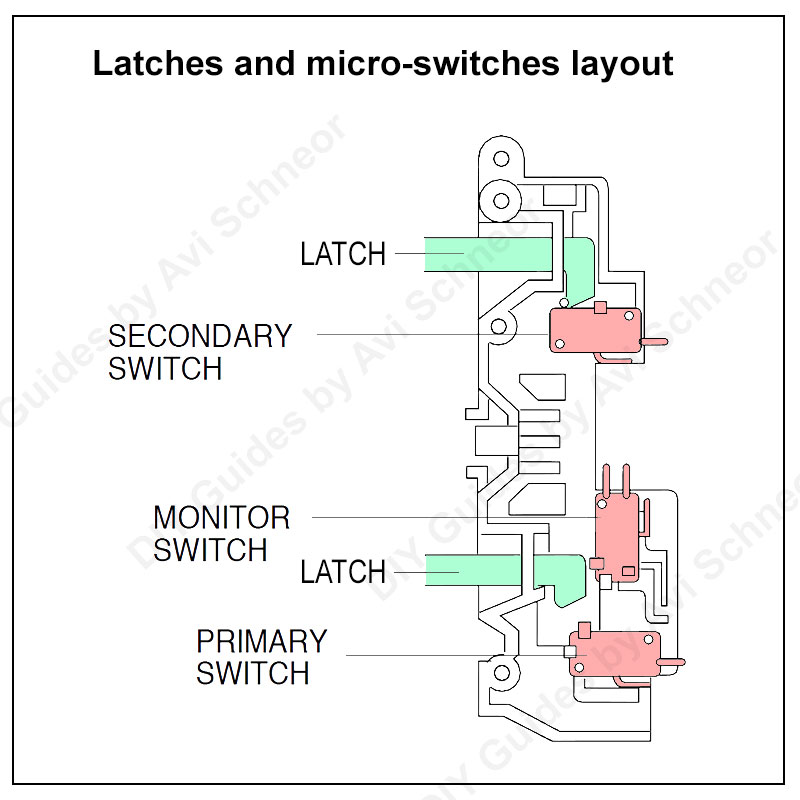 3. While not connected to mains, check the door alignment. If it looks OK in both open and close position, go further and disassemble the three micro-switches that are located where the door’s latches enters the interlock mechanism.
